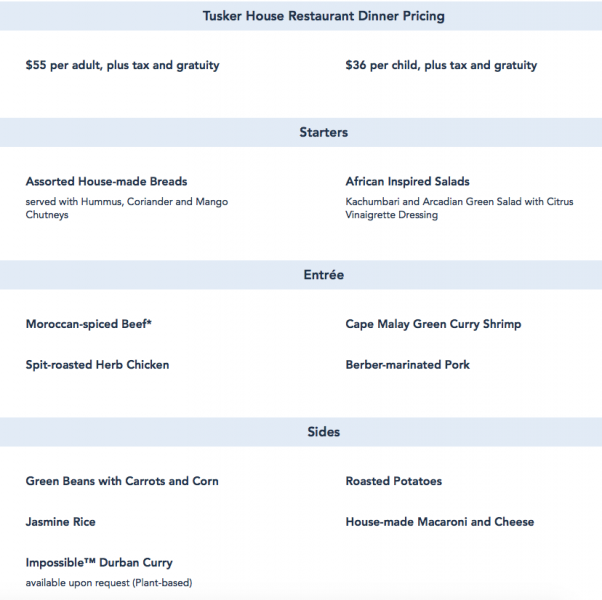 First up, we’ve got breakfast. If you’re hoping to have breakfast at Tusker House, it will be served family-style and will cost you $42 per adult and $27 per child.