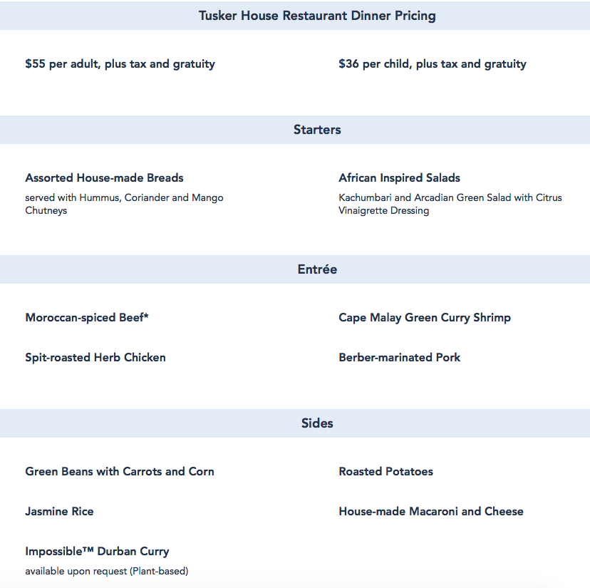 Earlier today, Disney shared the official date on which the restaurant will reopen and when reservations will become available. But there was still one thing we were waiting on…details about the food that would be served and the cost! Now, menus and pricing have been released for all of the meals that will be served at Tusker House and we’re sharing all of that information right here with you.