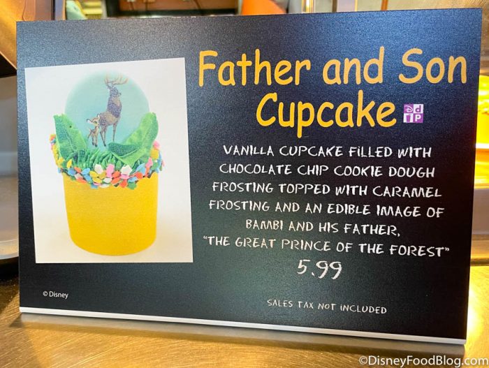 If you remember the Mother’s Day cupcake that popped up in Disney’s Animal Kingdom last month, you won’t be surprised that the Father and Son Cupcake looks pretty similar! But while it is a basic vanilla cupcake, it’s got a chocolate chip cookie dough filling and is topped with caramel frosting. Sounds interesting, right?! The whole thing is decorated with a white chocolate disk and flower-and-grass frosting.
