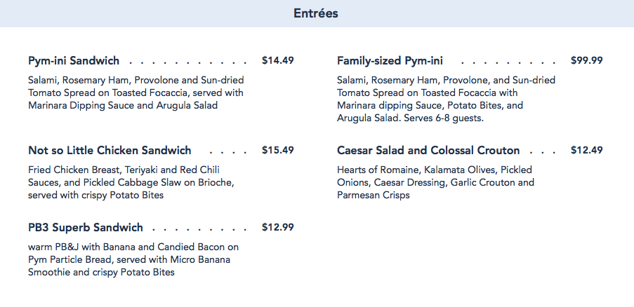 You can get the regular sized Pym-ini sandwich for $14.49, which comes with the marinara dipping sauce and arugula salad (but no potato bites).