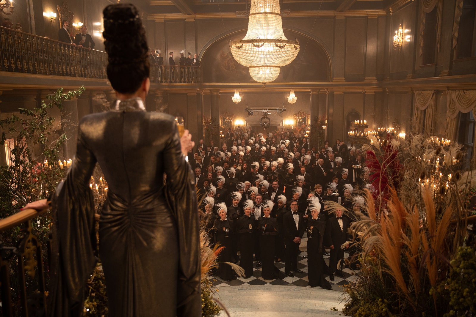 Felton noted that “We wanted a house that felt like it was a grand country house that would make a big impression on young Estella when she arrives with her mother. It needed to look wild and huge with the sea crashing on the rocks below.” In order to show off the lavish parties that the Baroness would hold, the exterior was redecorated to fit the tastes of the character. Felton provided the details that “We added a canopy to one side of the house, as we needed to see guests going into the parties, and there wasn’t a grand entrance there. We used flowers and huge drapes in different themes for both of the events.”