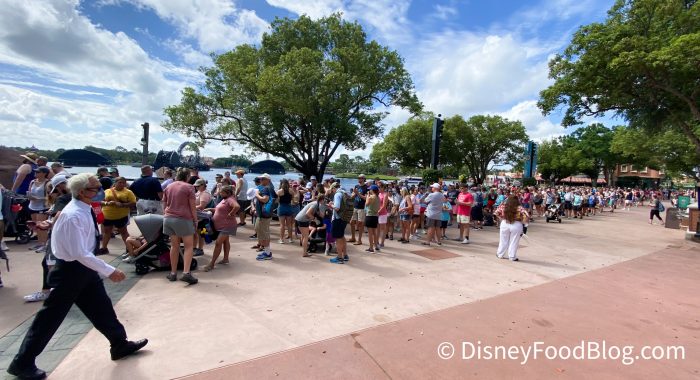 The crowd photos may look a little shocking and intense, but keep in mind that the International Gateway entrance is where you’ll enter EPCOT if you travel to the park via the Disney Skyliner. This back entrance is also steps away from Disney’s Beach and Yacht Club Resorts, as well as Disney’s BoardWalk Inn. So, there are a lot of resort guests that can easily access the International Gateway in the morning!