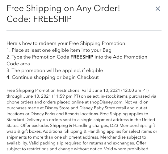 Today only, shopDisney is offering free shipping sitewide! You typically have to spend at least $75 to qualify, but until 11:59PM PT today, there is NO minimum purchase requirement. Just use code FREESHIP at checkout!