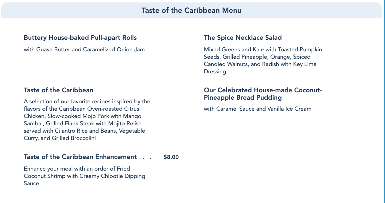 So what’ll be up for grabs? A NEW family-style dinner! It costs $29 per adult and $17 per child (not including tax or gratuity), and includes Pull-apart Rolls and The Spice Necklace Salad, a Taste of the Caribbean main dish, and Coconut-Pineapple Bread Pudding. You can pay an extra $8 for a side of Fried Coconut Shrimp.