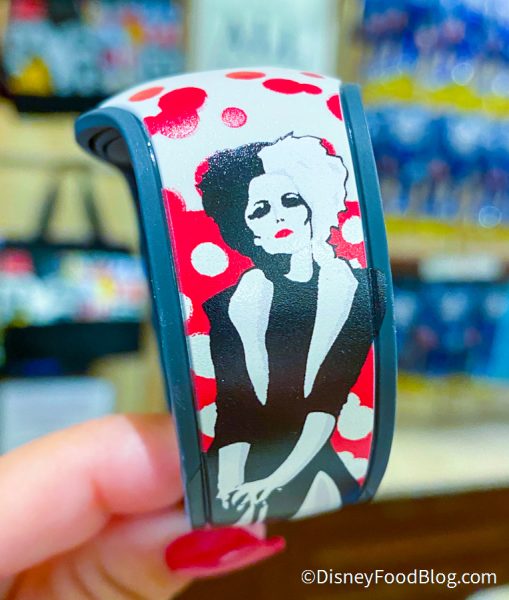 And now Cruella has her own MagicBand! The Cruella MagicBand is white with red spots and red and black icons, like Cruella’s lipstick.