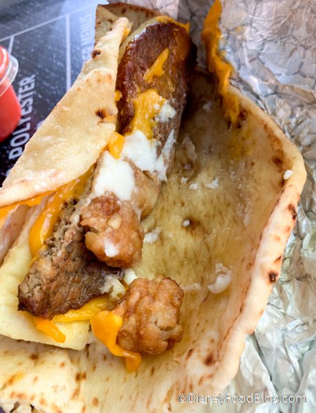 We’ll just tell you now that our favorite parts of this wrap were the potato bites, along with the spicy syrup. However, the plant-based sausage was pretty good, too!