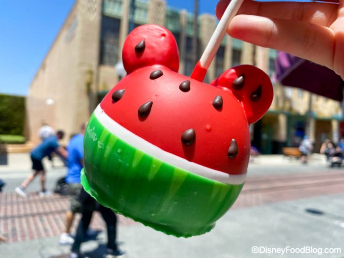 First up, we’ve got a food update from Trolley Treats in Disney California Adventure! We tried out the summery Watermelon Seasonal Apple for $11.99.