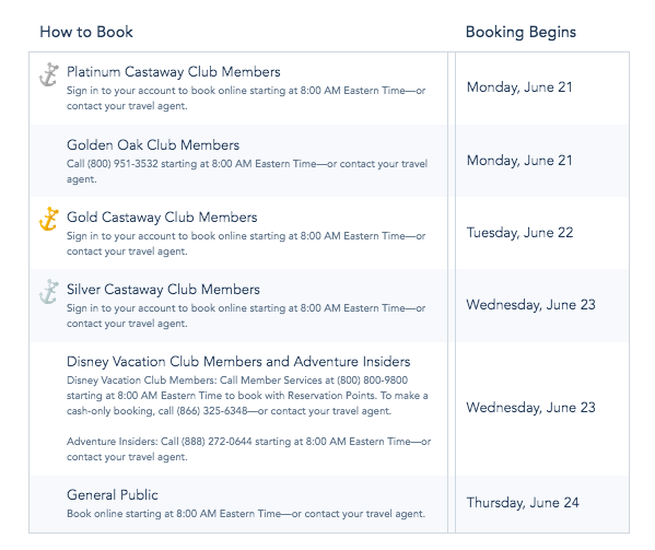 Bookings for fall 2022 cruises are opening SOON! As usual, Castaway Club members, Golden Oak Club members, Disney Vacation Club Members, and Adventure Insiders have access to early booking windows that begin June 21st. And on June 24th, reservations will open to the general public!