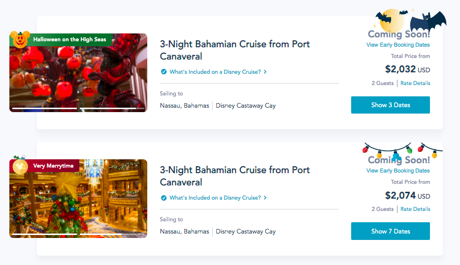 Guests have LOTS of cruises to choose from — including special holiday cruises like Halloween on the High Seas and Very Merrytime! Guests will be able to attend Mickey’s Mouse-querade Party, say hello to Santa Claus, and more.