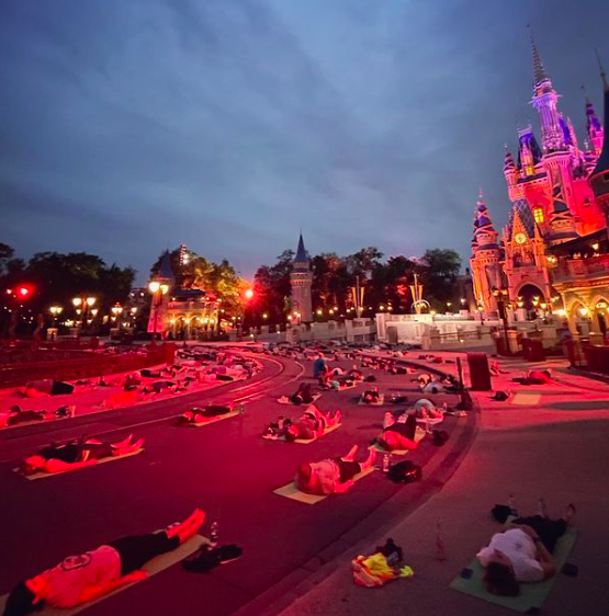 That’s right — Disney Cast Members had a sunrise yoga session outside of Cinderella Castle before Magic Kingdom opened to celebrate International Yoga Day!