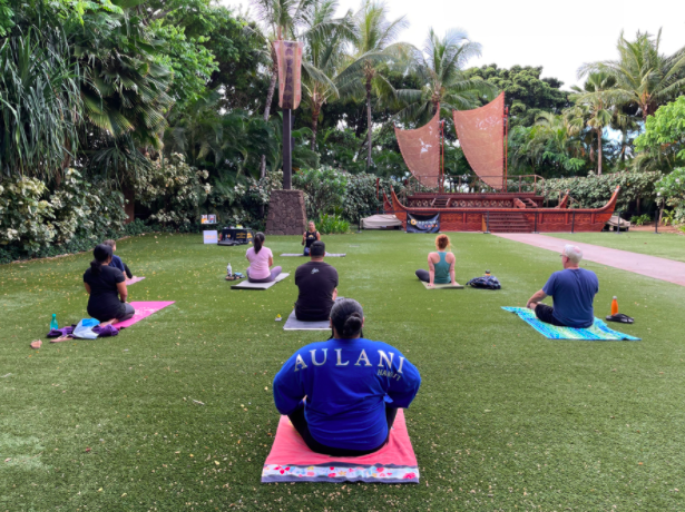 In the tropical Disney’s Aulani Resort in Hawaii, cast members met outside for a morning yoga session as well!