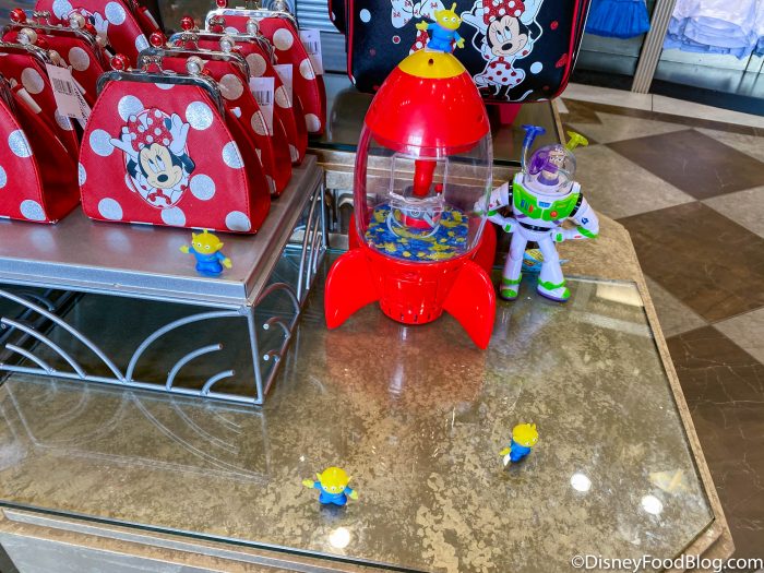 Scattered throughout a display there were some green Aliens from Toy Story.