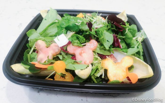 This meal is FULL of Mickey-shaped food, and it even starts in the salad! The Garden Salad is a pretty typical Disney salad, and there’s plenty to be shared between 3-4 people. It comes with Ranch and Italian Dressing, and they gave us so much that we could’ve drowned the salad in it! We loved the salad overall — it was an awesome mix of fresh greens and tons of tomatoes, carrots, and cucumber cut into small Mickey-shapes.