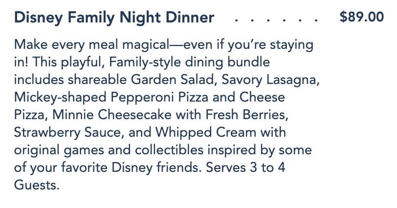 🌟 Includes garden salad, lasagna, Mickey-shaped cheese or pepperoni pizzas, and Minnie cheesecake