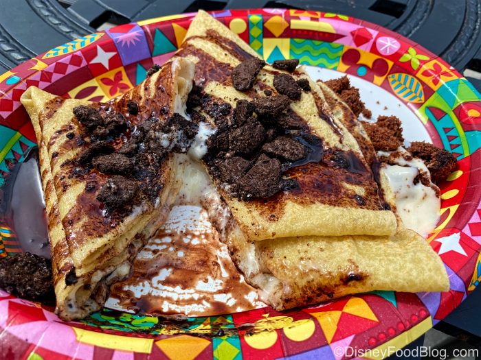 AristoCrêpes’ Cookies and Cream Crêpe is available at their Disney Springs kiosk and features Cream Filling, Chocolate Chiffon Cake, Chocolate Sauce, and Cookie Pieces!