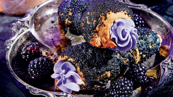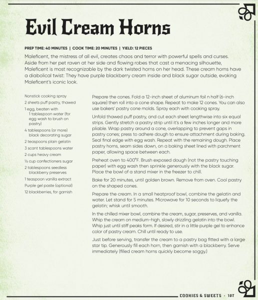 Good Morning America showed a sneak peek at a few of the sinister creations before the book goes on sale! There’s the Evil Cream Horns which have a beautiful purple filing à la Maleficent, the Mistress of Evil.