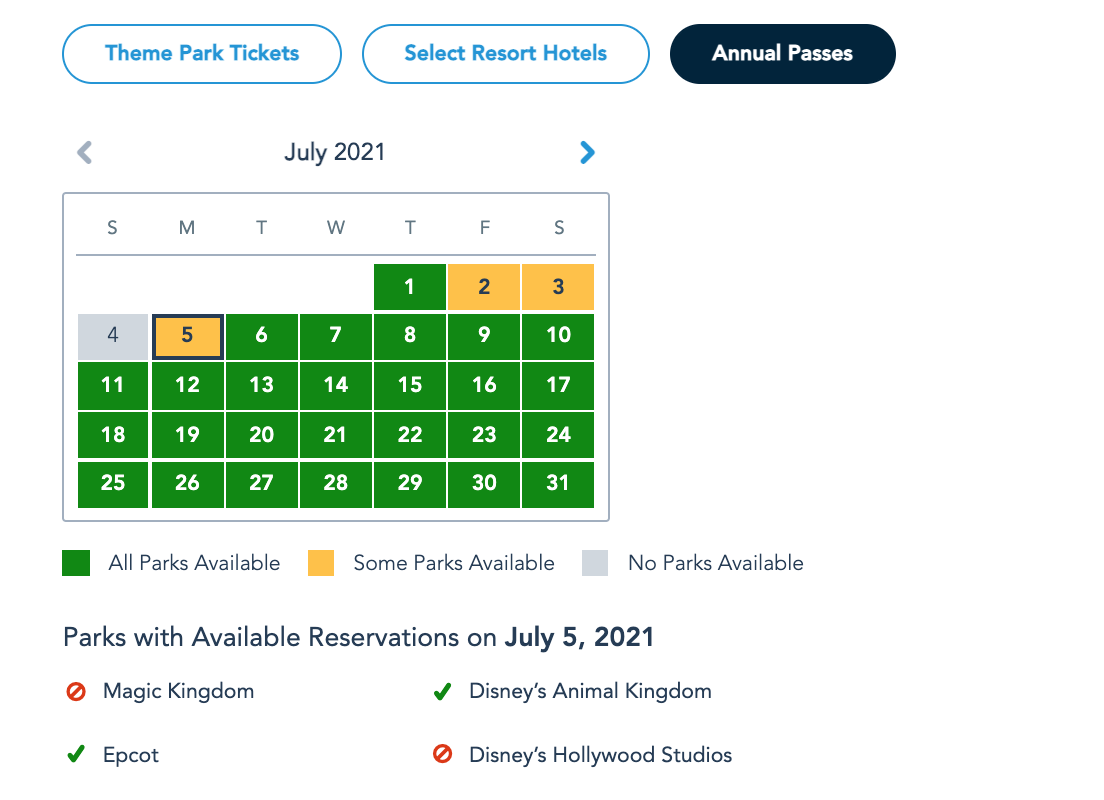 Disney Park Pass Reservation availability for Annual Passholders on July 5th as of July 1st © Disney