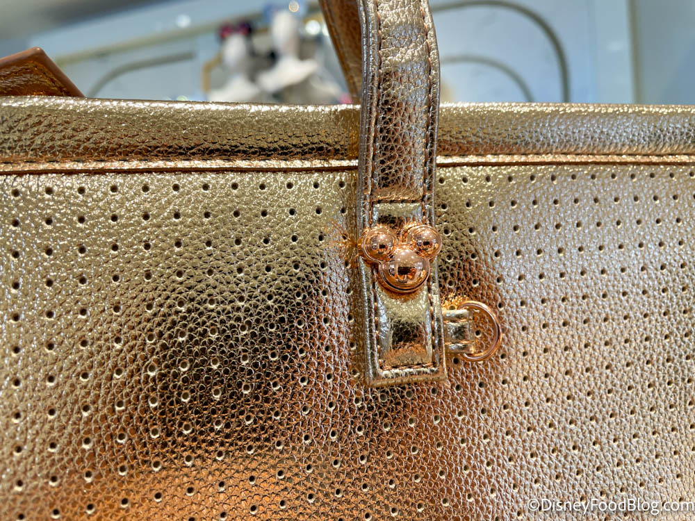The backpack and tote bag both had Mickey head details and were made of a shiny, rose gold material.