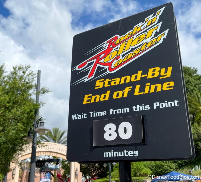 Rockin’ Rollercoaster is another busy ride, and it was at 80 minutes when we saw it! Both of these rides get really crowded during the day, so you’ll want to rush over or stay late for the lowest times! And make sure you keep an eye on the times on the My Disney Experience app, just in case there’s a lull during the day sometime!