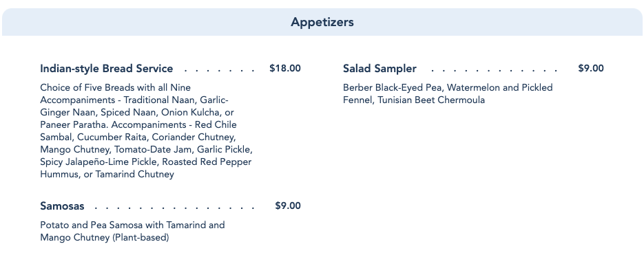 The bread service comes with FIVE different kinds of bread and NINE — yes, you read that right — sauces and dips! The breads are Traditional Naan, Garlic-Ginger Naan, Spiced Naan, Onion Kulcha, or Paneer Paratha. The many accompanying sauces are (1) Red Chile Sambal, (2) Cucumber Raita, (3) Coriander Chutney, (4) Mango Chutney, (5) Tomato-Date Jam, (6) Garlic Pickle, (7) Spicy Jalapeño-Lime Pickle, (8) Roasted Red Pepper Hummus, or (9) Tamarind Chutney!