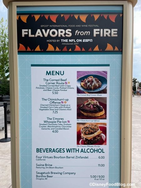 The first menu that we came across was Flavors from Fire. The menu this year is featuring two savory dishes and one dessert with three alcoholic beverage options. These food items are all returning and are some fan-favorites!