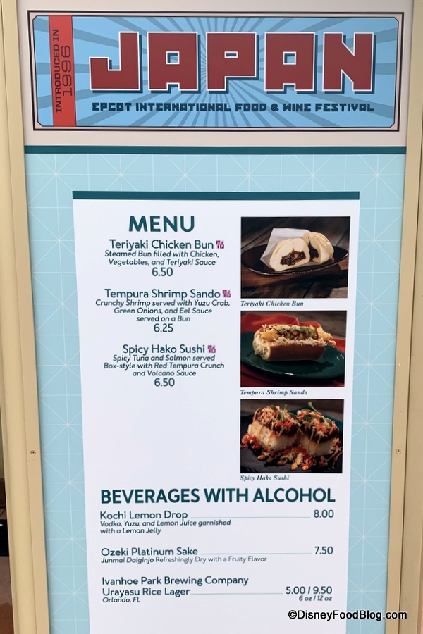 Next on our journey around World Showcase was the China booth which had its menu on display. This menu featured some delicious-looking Pan-Fried Chicken Dumplings and a ZiRanBeef Bao Bun as well as one of our favorite cocktails the ByeJoe Punch!
