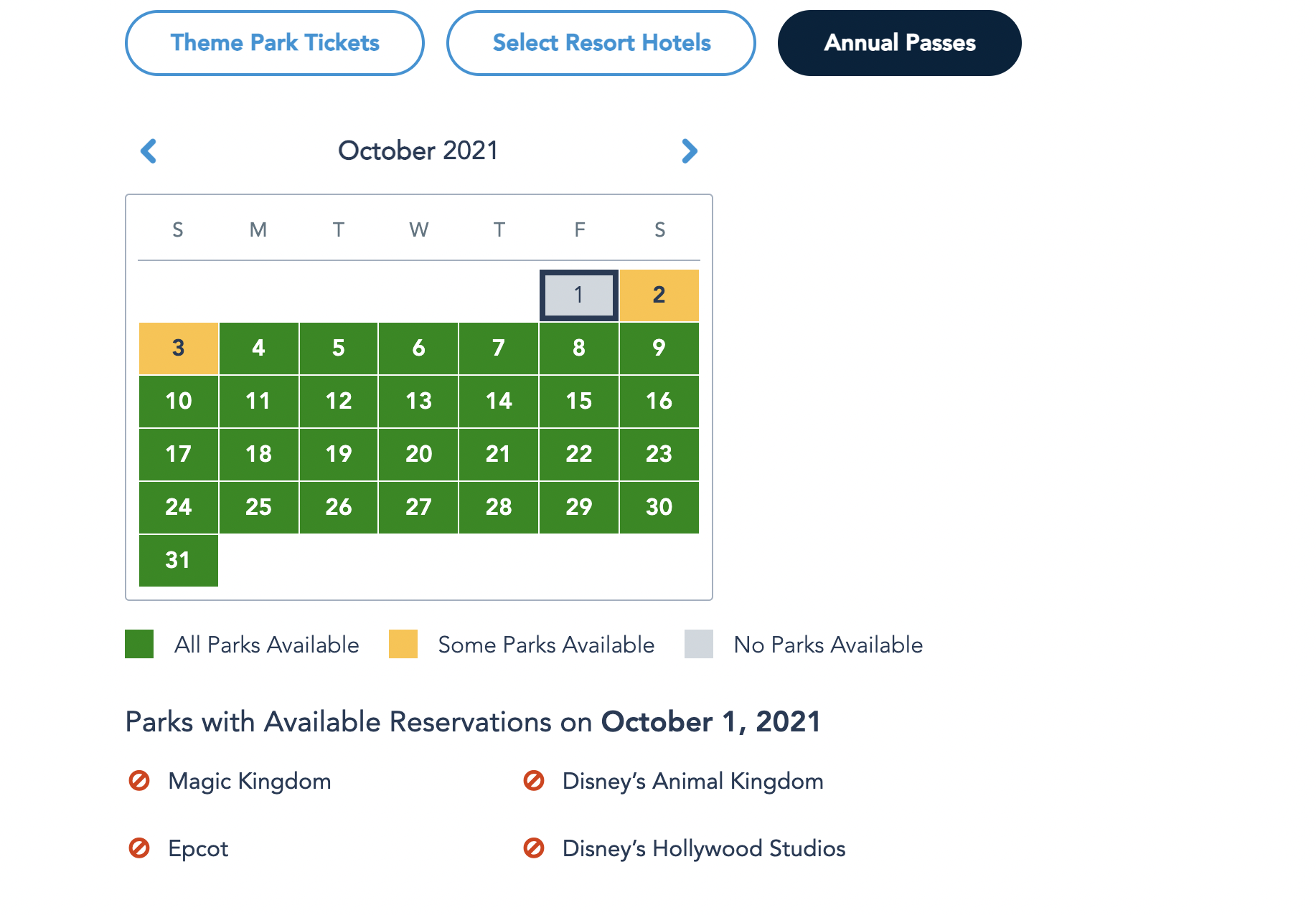 As of right now, you won’t find any Park Pass availability for Magic Kingdom or EPCOT on October 1st for any of the different buckets that Disney separates Park Pass Reservations into. Availability varies for different guests for other theme parks, however. If you are not an annual pass holder and just have Theme Park Tickets for October 1st then you still have availability to book a reservation for both Disney’s Animal Kingdom and Disney’s Hollywood Studios.