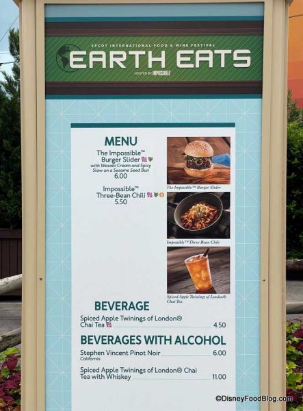 Several items from last year’s Earth Eats booth are gone from the booth this year including the Chocolate Pudding Terrarium and some tea options. This year’s menu includes 1 returning item (the Impossible Burger Slider), a new food item, and 3 new drinks.