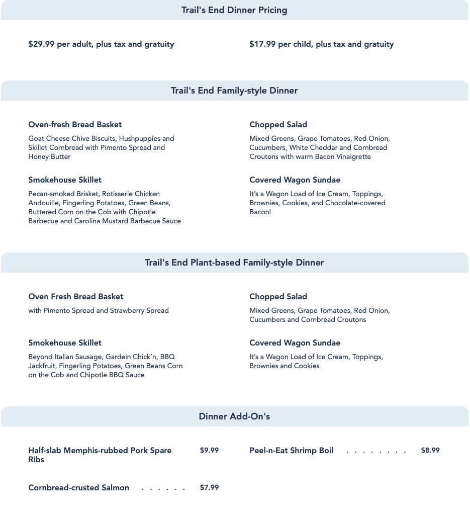 - You’re not close to Trail’s End! The food is decent and the price is good, but if an evening of navigating the wild world of Fort Wilderness doesn’t sound like fun, maybe mosey on by this one.