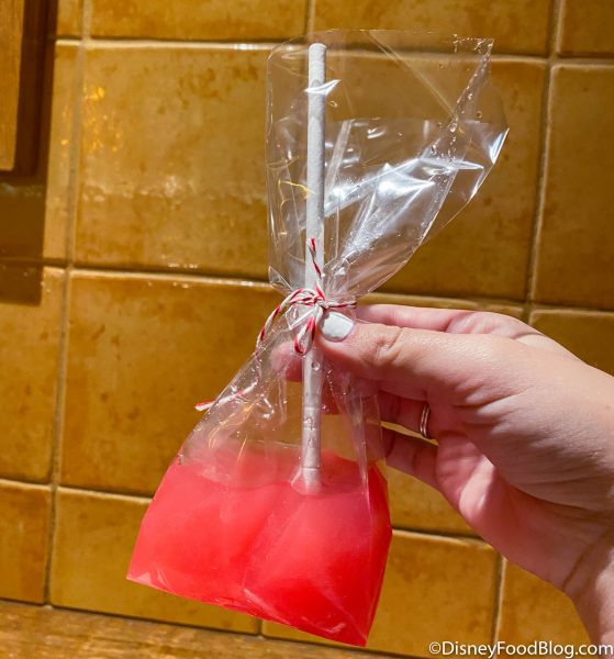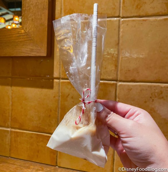 But of course we loved the golden, malty Mickey Waffles as well! With round two in our belly, we headed back up to the buffet (what can we say, we missed the experience!). This go round, we spotted something very odd — juice and milk in…bags?