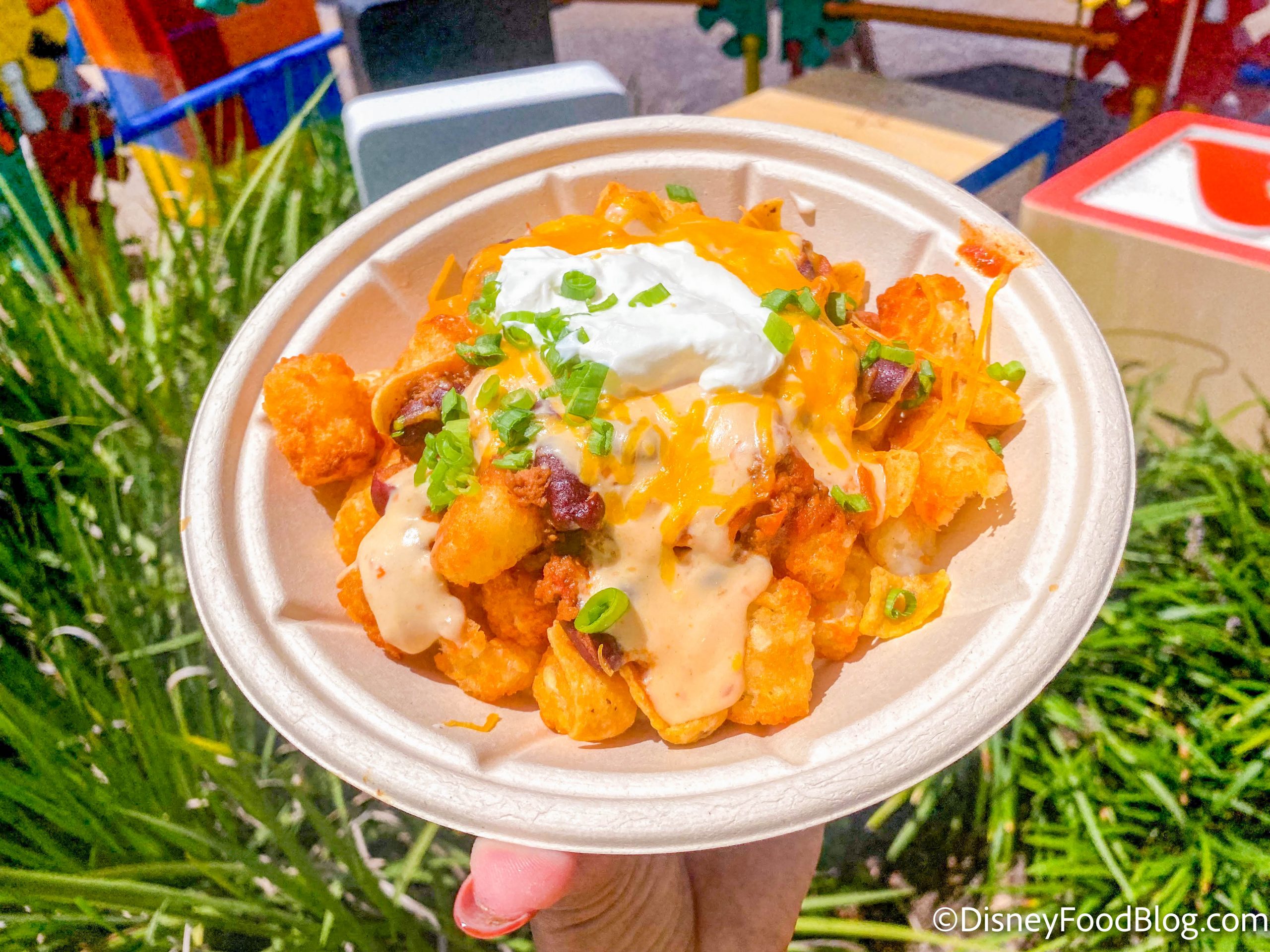 The Totchos come with beef and bean chili, shredded cheese, queso, tomatoes, corn chips, green onions, and sour cream. YUM. Lots of protein for a busy Disney day!