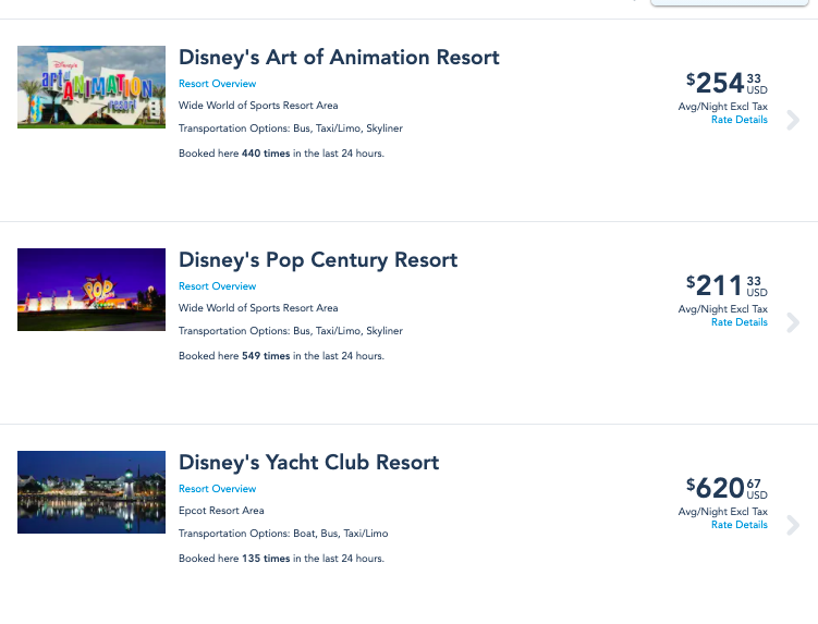 Some hotels haven’t reopened (or haven’t completely reopened), so there are fewer rooms than usual open at Disney World. When we checked for hotels available in the next few days (we looked at July 28th, 2021), there were only three options: Disney’s Art of Animation Resort, Disney’s Pop Century Resort, and Disney’s Yacht Club Resort.