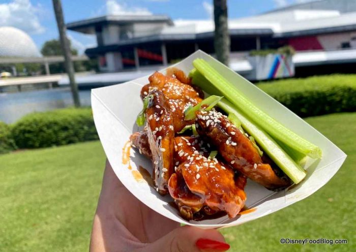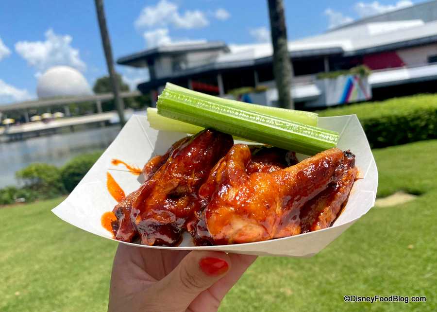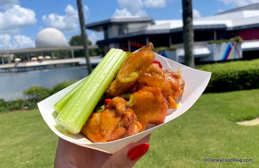 We’ve been VERY hyped about all the new booths at the EPCOT Food & Wine Festival, and the Brew-Wing at the EPCOT Experience combines two fan-favorite items — beers and wings! The menu is made up of mostly chicken wings with five different flavors ranging from mild to hot.