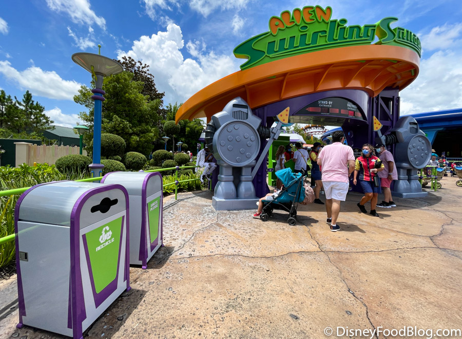 Typically, you would find these trash cans inside of the queue of Alien Swirling Saucers but it looks like they now have a matching pair outside the entrance as well for everyone to enjoy!