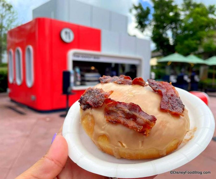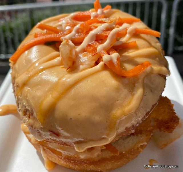 The Donut Box at EPCOT’s International Food and Wine Festival is serving up delicious donuts, coffee, and donut sandwiches! The booth’s Crispy Chicken on a Sriracha-glazed Donut made the Best of the Fest list this year, it was a super yummy sweet-savory treat!