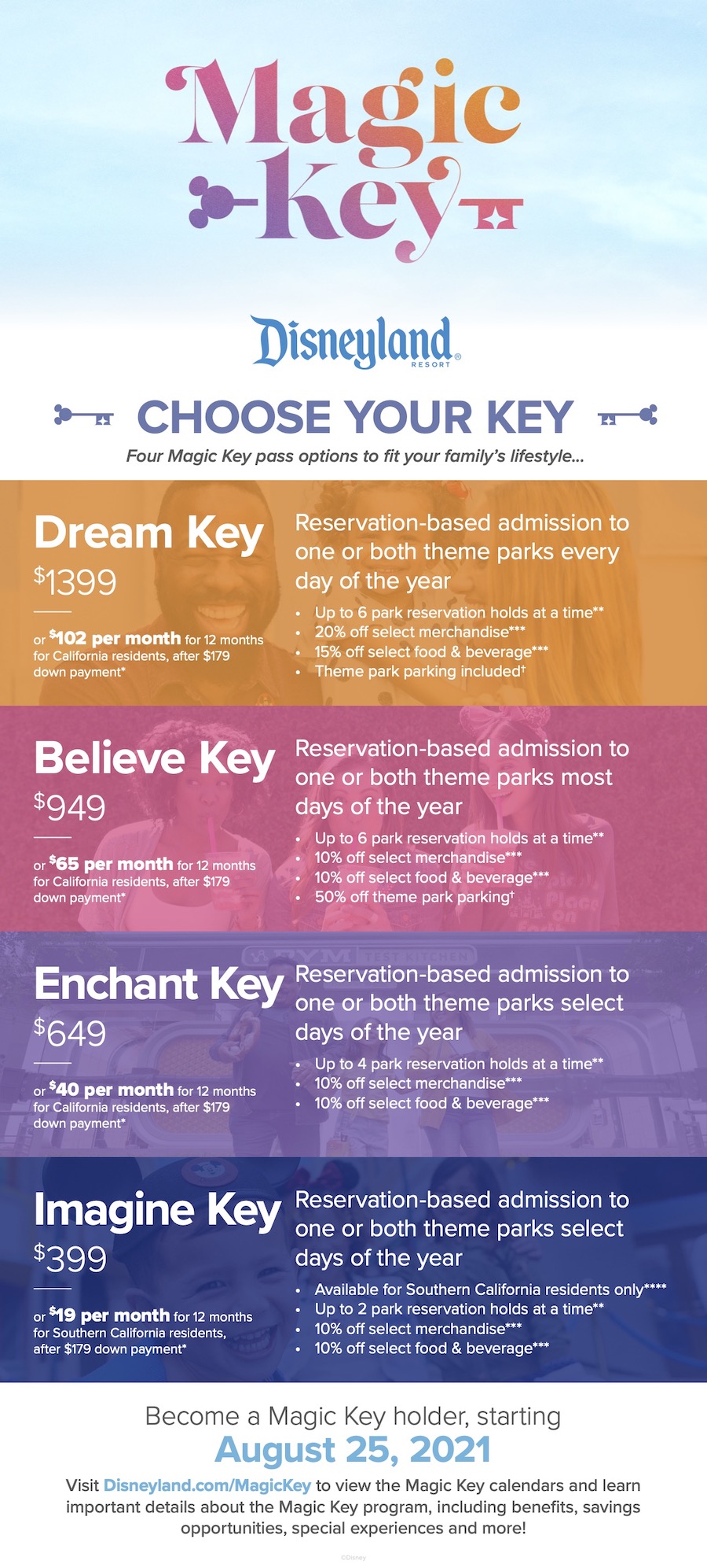 Magic Keys will be available beginning August 25th, 2021, no earlier than 10AM PST. Those who purchase a pass on August 25th will be able to make theme park reservations to visit Disneyland Resort starting that same day.