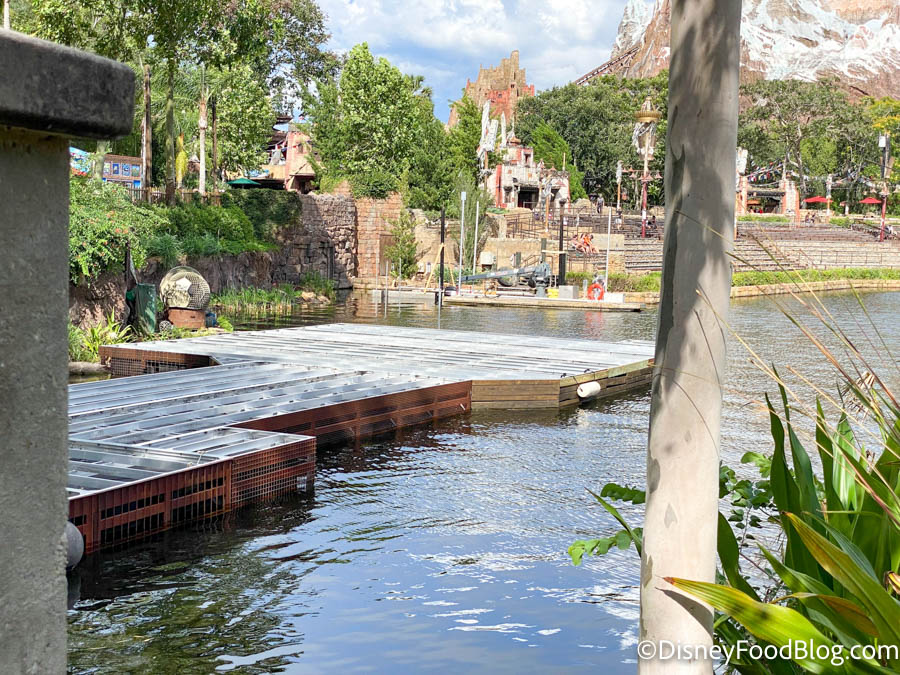 After a few years of having no nighttime show at the Discovery River Amphitheater, Disney is preparing to bring a brand new daytime show, called Disney KiteTails, to the location in just a few months! We’ve been keeping track of the construction (which has been fairly minimal so far), but this week we noticed that the large barges that once floated on the water near the theater are now missing!