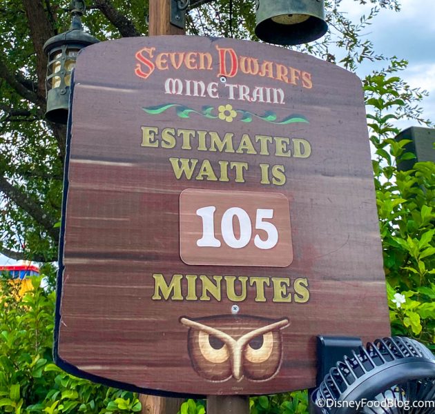 But Seven Dwarfs Mine Train across the path had a line that was 105 minutes long. This ride is one that you’ll want to hurry to in the morning, because it usually has a long wait!