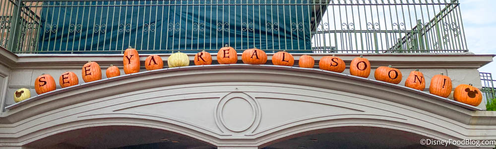 Above the exit to the Magic Kingdom, Mickey’s classic saying “See ya real soon” is written in the pumpkins!