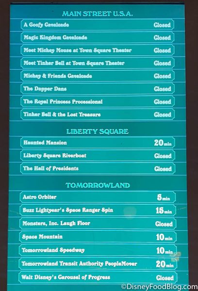 Some attractions, like Haunted Mansion, the Tomorrowland Transit Authority PeopleMover, and Space Mountain were showing pretty consistent wait times. They were all still hovering around 15-20 minutes. It looks like the line for Seven Dwarfs Mine Train was getting shorter, though, with a 30 minute posted wait time.