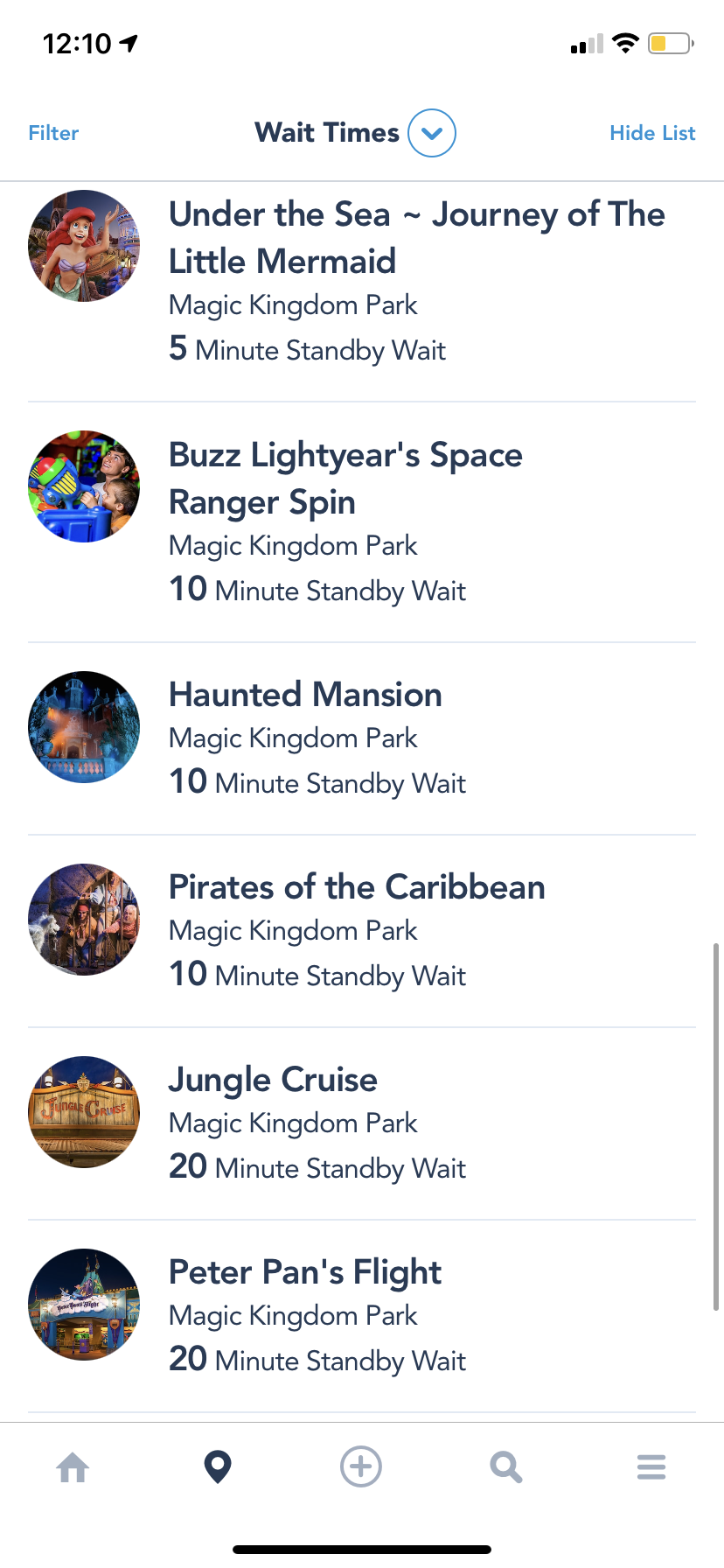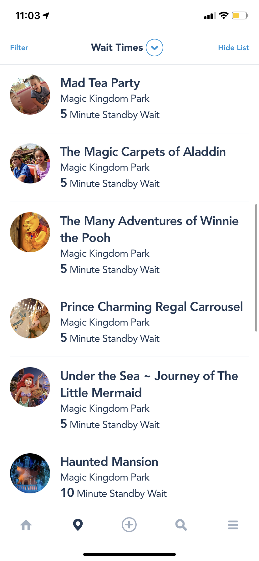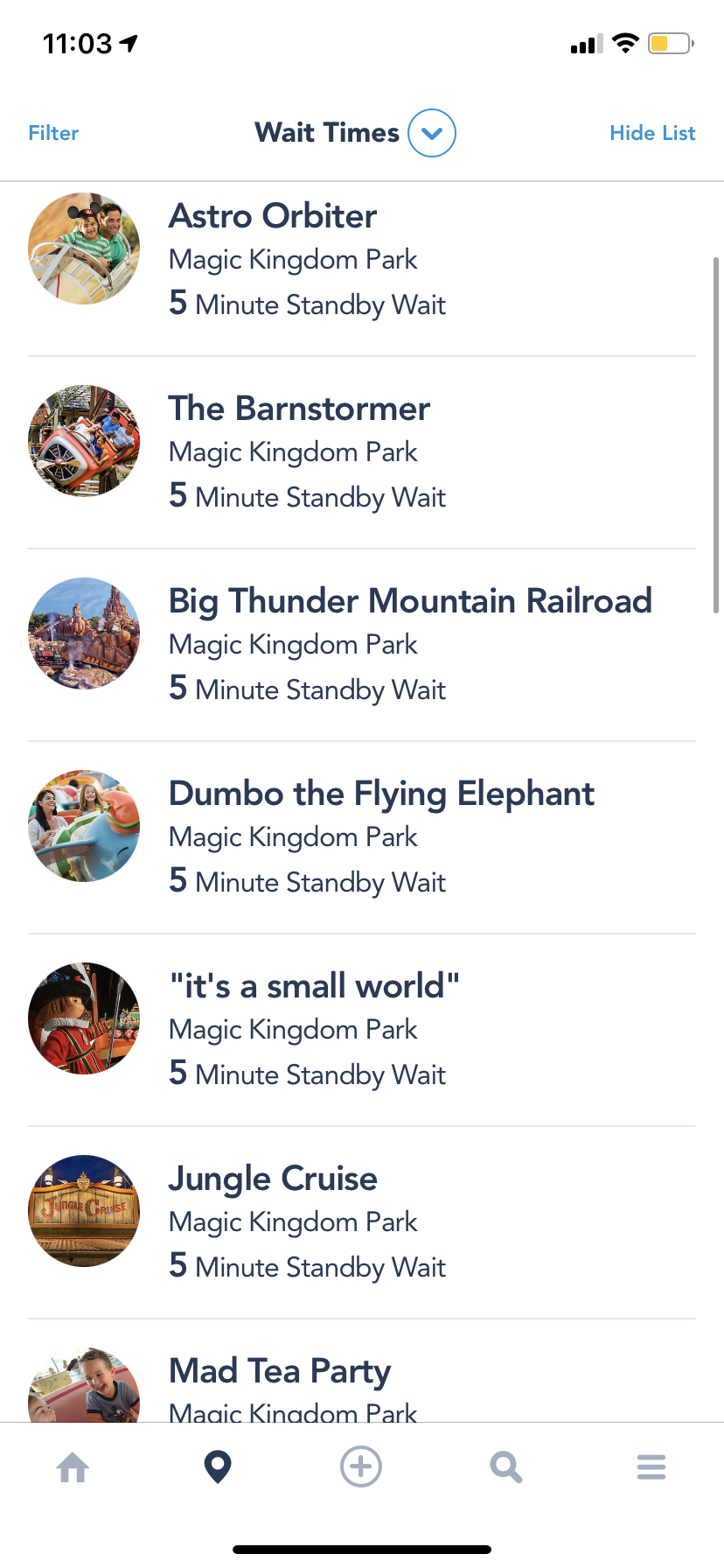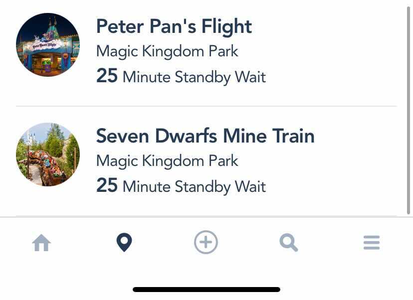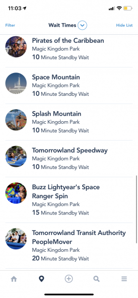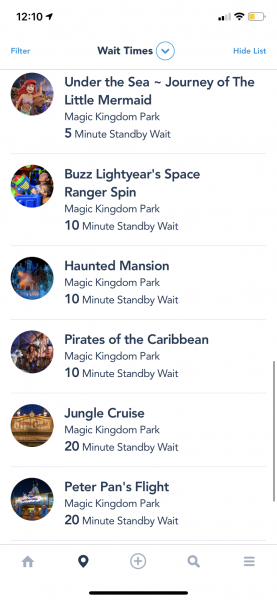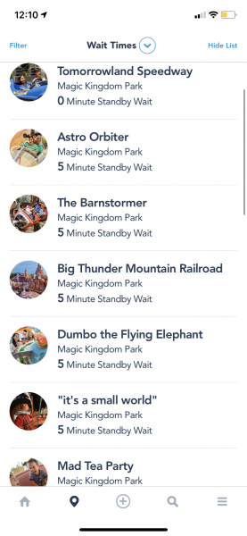 Over on the My Disney Experience app, we checked back in with Fantasyland’s attractions, and saw more low waits!