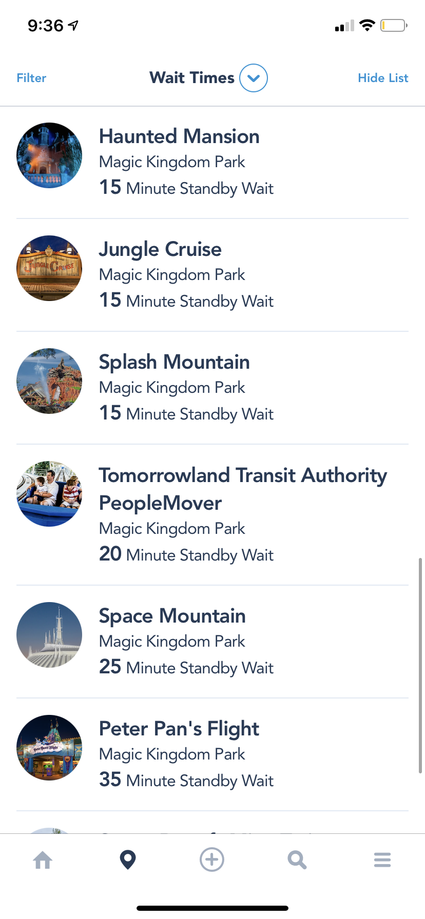 The Haunted Mansion wait time increased by 10 minutes, showing a 25-minute standby line. Meanwhile, Splash Mountain went from 15 minutes at 9:30 to 10 minutes an hour later!