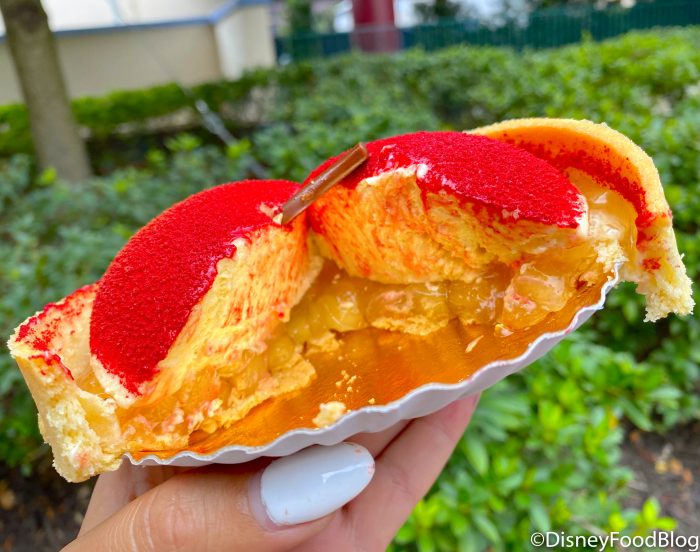 This treat it reminds us a lot (some in terms of look and others in terms of ingredients) of a few treats we’ve seen before like the apple tart we saw in Disneyland in 2019 and the Poisoned Candy Apple we saw in Disney World last year.