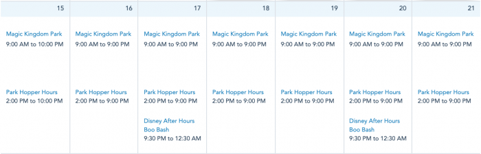 Magic Kingdom will be open on Sunday, August 15th from 9AM-10PM. For the rest of the week, Magic Kingdom will be open from 9AM-9PM. Disney After Hours BOO Bash will take place on Tuesday, August 17th and Friday, August 20th. Both events will last from 9:30PM-12:30AM.
