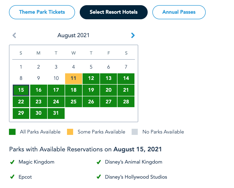 Park Pass Reservation availability for guests staying at Select Resort Hotels on August 15th as of August 11th © Disney