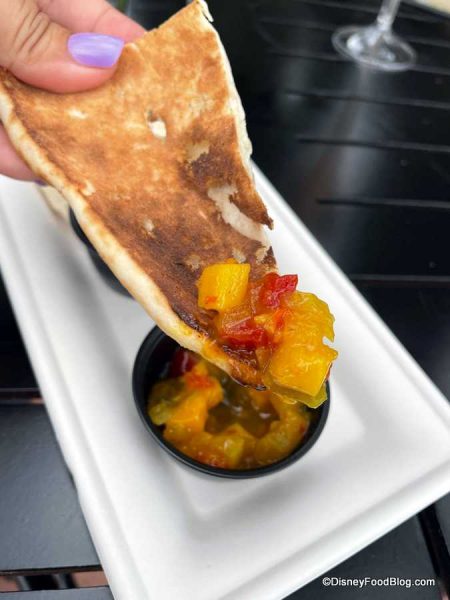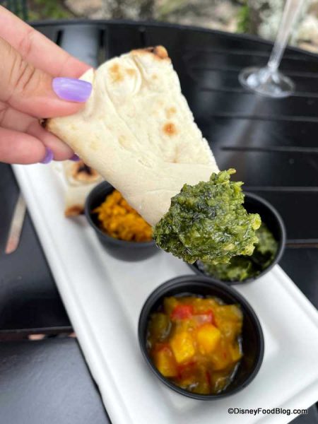 First, we’ve got the returning Warm Indian Bread with Pickled Garlic, Mango Salsa, and Coriander Pesto Dips. We know what you’re thinking, and we are right there with you! Bread service, HERE WE COME!