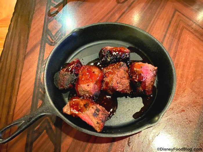 Next, we got the ‘Ohana Dinner Skillet with Wood-fire Grilled Teriyaki Beef, Spicy Peel-n-Eat Shrimp, Grilled Chicken with Polynesian-inspired Chimichurri Sauce, ‘Ohana Noodles, and Roasted Broccolini! It’s actually not one, but FOUR skillets of delicious goodness! The ‘Ohana Noodles were amazing (we could write a whole book about those tasty noodles!) and we really enjoyed having all these ‘Ohana favorites back! We also grabbed the Honey-Coriander Chicken Wings and the Pork Dumplings Tossed In Garlic-Chili Sauce, which were both delicious savory options!