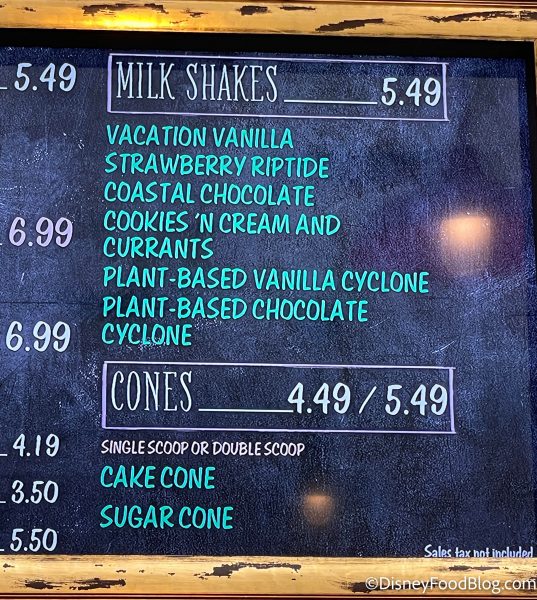 In May of this year, BoardWalk Ice Cream opened on Disney World’s BoardWalk. We happened to be at Disney’s BoardWalk today and noticed that milkshakes have been added to the menu, including Vacation Vanilla, Strawberry Riptide, Coastal Chocolate, Cookies ‘n Cream and Currants, Plant-based Vanilla Cyclone, and Plant-Based Chocolate Cyclone for $5.49 each. Of course we had to try some!