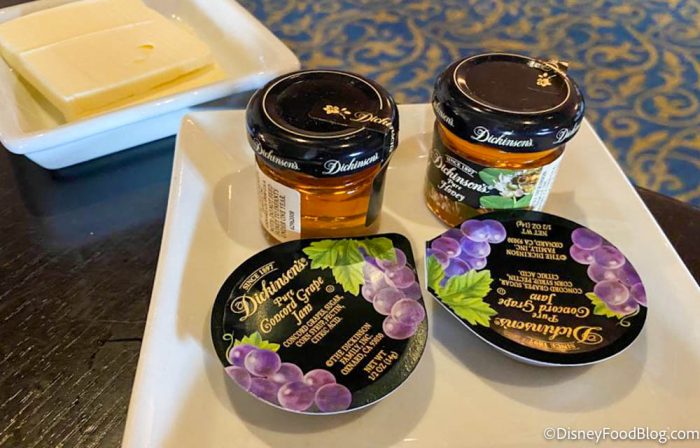 We asked for some condiments for the pastries, and we were given honey, grape jam, and butter.
