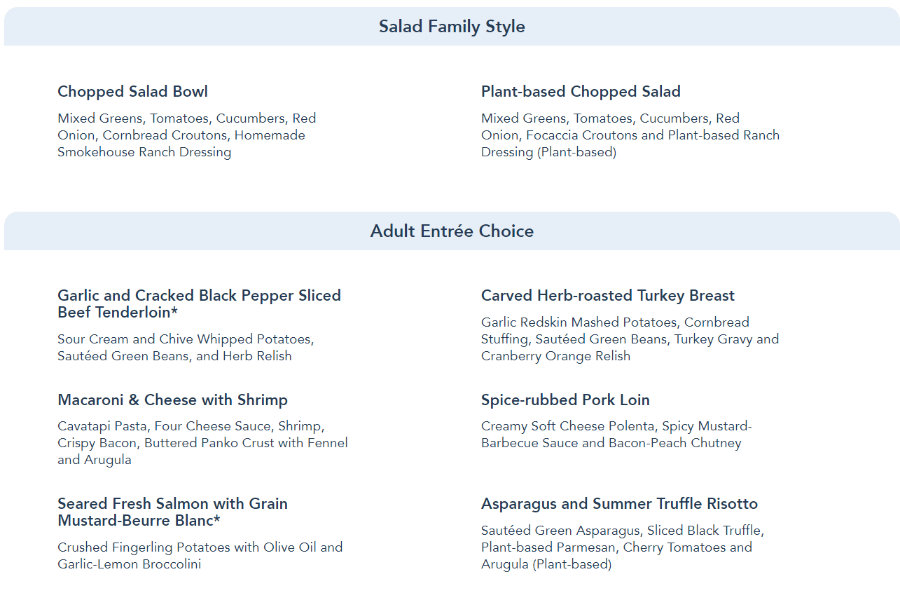 Entree choices include Garlic and Cracked Black Pepper Sliced Tenderloin, Carved Herb-roasted Turkey Breast, Macaroni & Cheese with Shrimp, and more. The entrees are mostly unchanged from last Halloween. The Plant-Based option has swapped from Pan Roasted Trumpet Mushrooms to an Asparagus and Summer Truffle Risotto. The nummy Pork Osso Bucco we enjoyed last time is replaced by a Spice-rubbed Pork Loin. The beef option is largely unchanged but the cut of meat has shifted from Prime Rib to a Tenderloin.